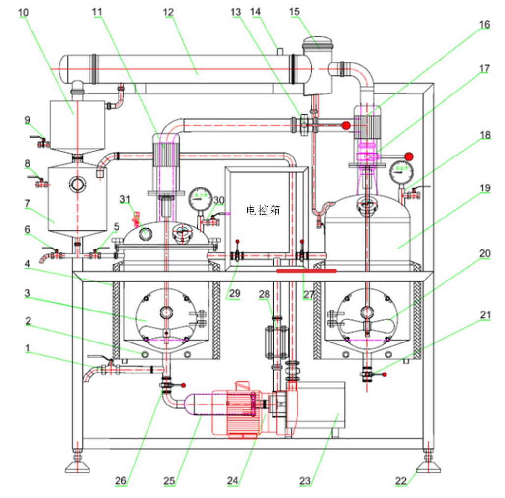 25.管道過濾器; 26.出料閥; 27.濃縮罐進(jìn)料閥; 28.管路視鏡; 29.熱回流閥; 30.放氣閥; 31.投料口